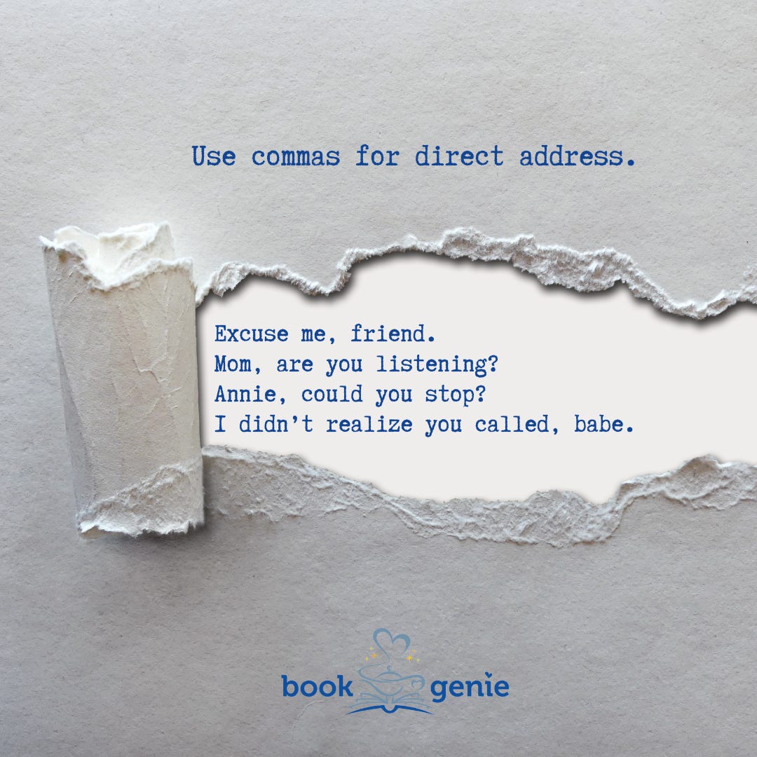 You may shocked to learn this, dear reader, but when you address a person/character in text, you must set the name or noun that refers to that individual off with commas. Here are a few examples: