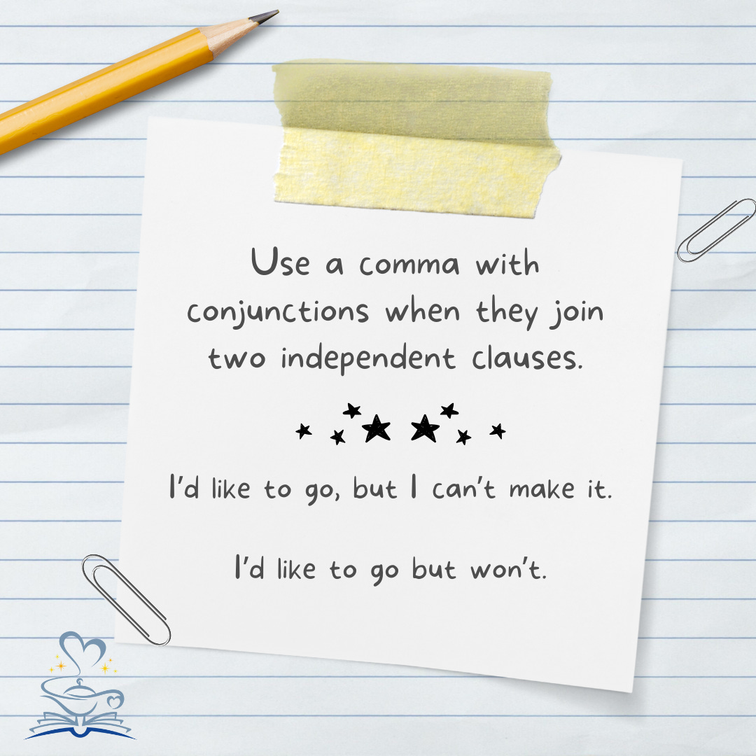 5. Only use a comma with conjunctions when they join two independent clauses.
