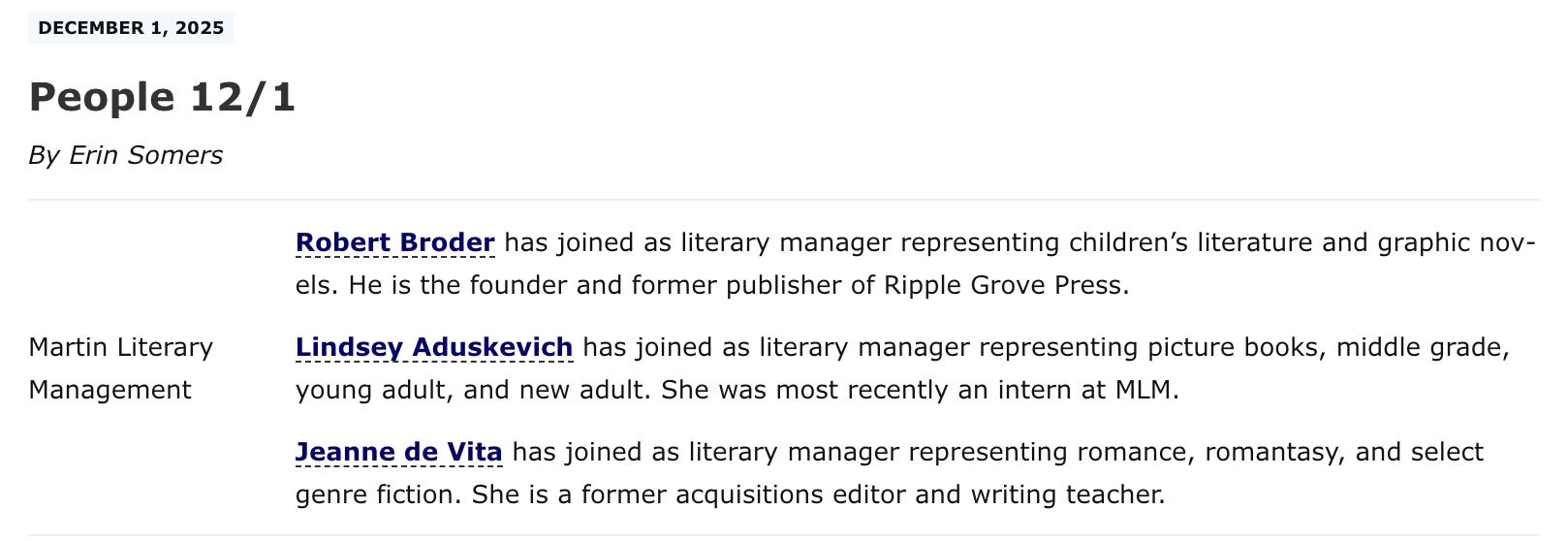 If you follow me on social media, you’ve likely seen the news: I am, as of December 1, 2025, a literary agent with Martin Literary Management!